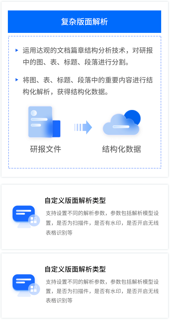 研报信息结构化提取 基于自研的复杂版面分析技术,对双栏复杂的研报进行解析,区分标题、段落、图片、表格等信息,为研报数据、文本、观点抽取和审核建立基础。